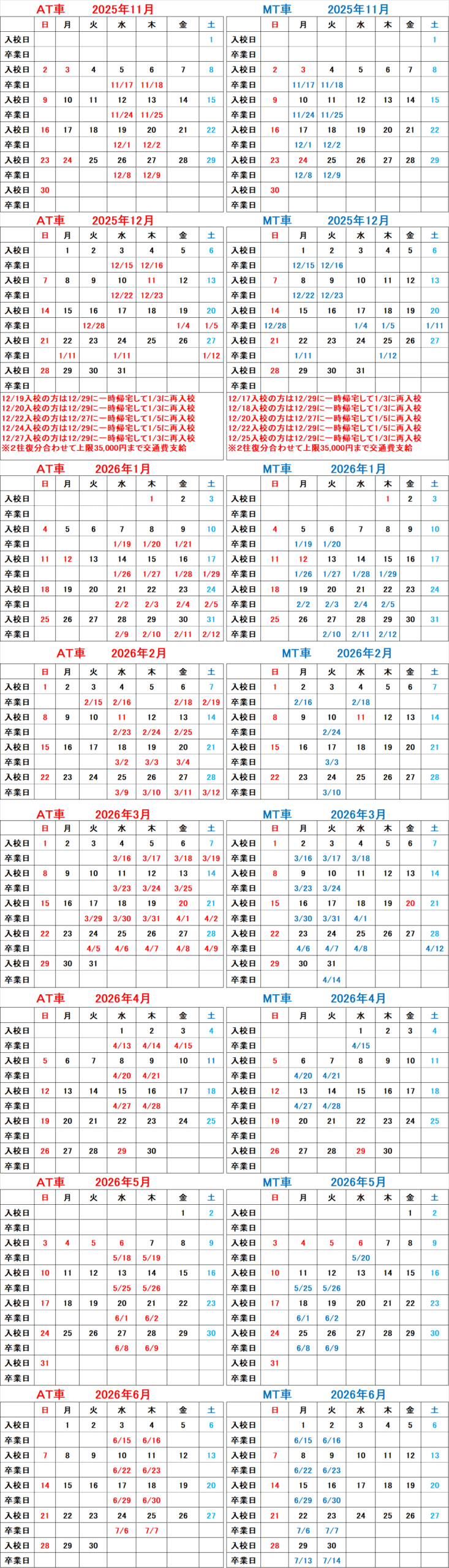 AT車12泊13日 MT車14泊15日